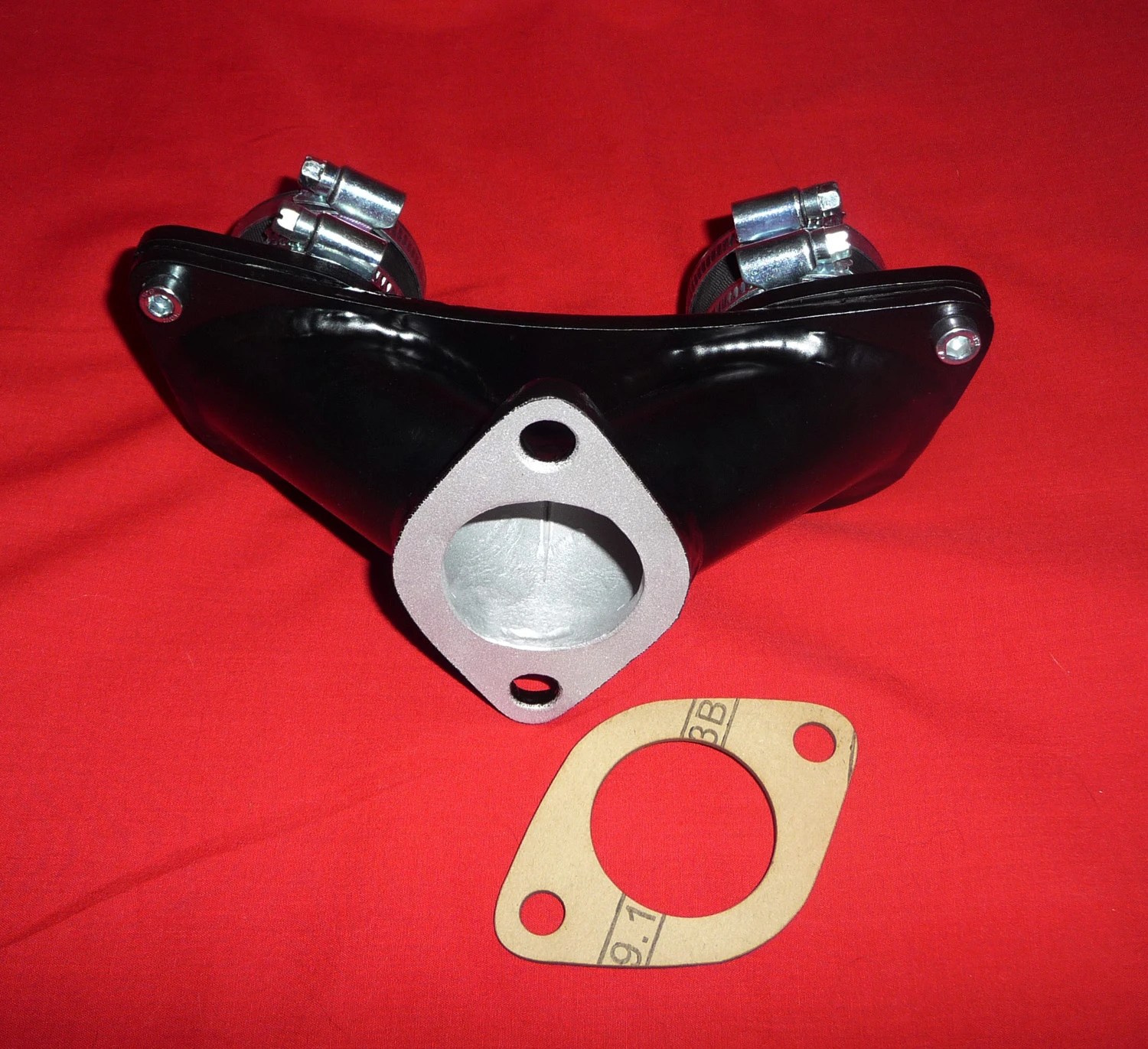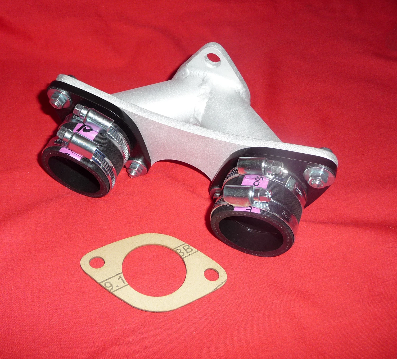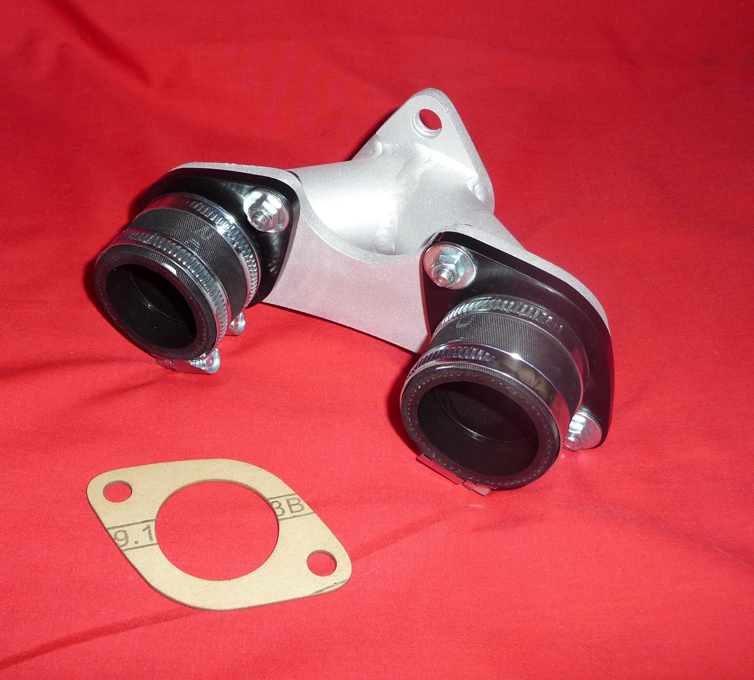 Manifold is made of aluminum, smooth finish. Mounting boots are 40 mm ID. Mikuni VM30-34 carburetors can be installed. Also FCR35, PWK34 carburetors as well. This manifold replaces a S&S super E carburetor to two Mikuni VM30 or similar carburetors. So it can be installed on models that came with S&S set up.