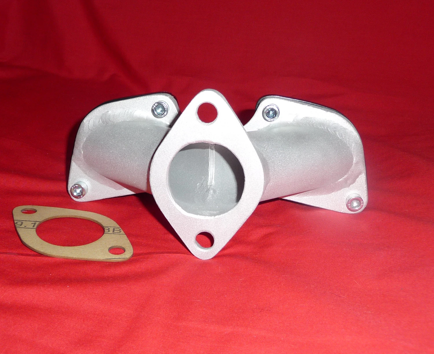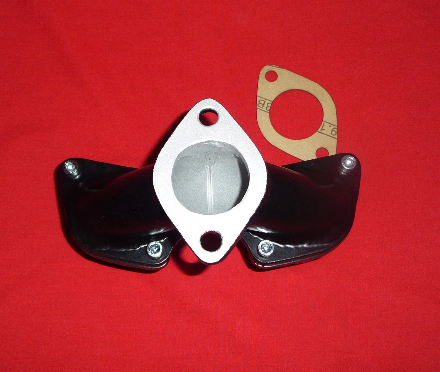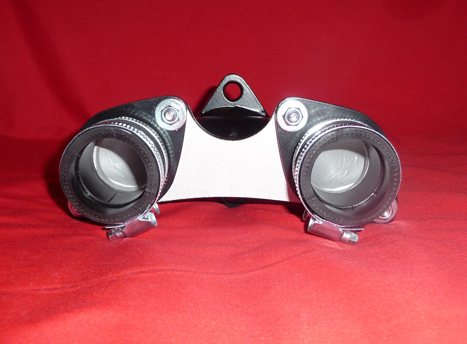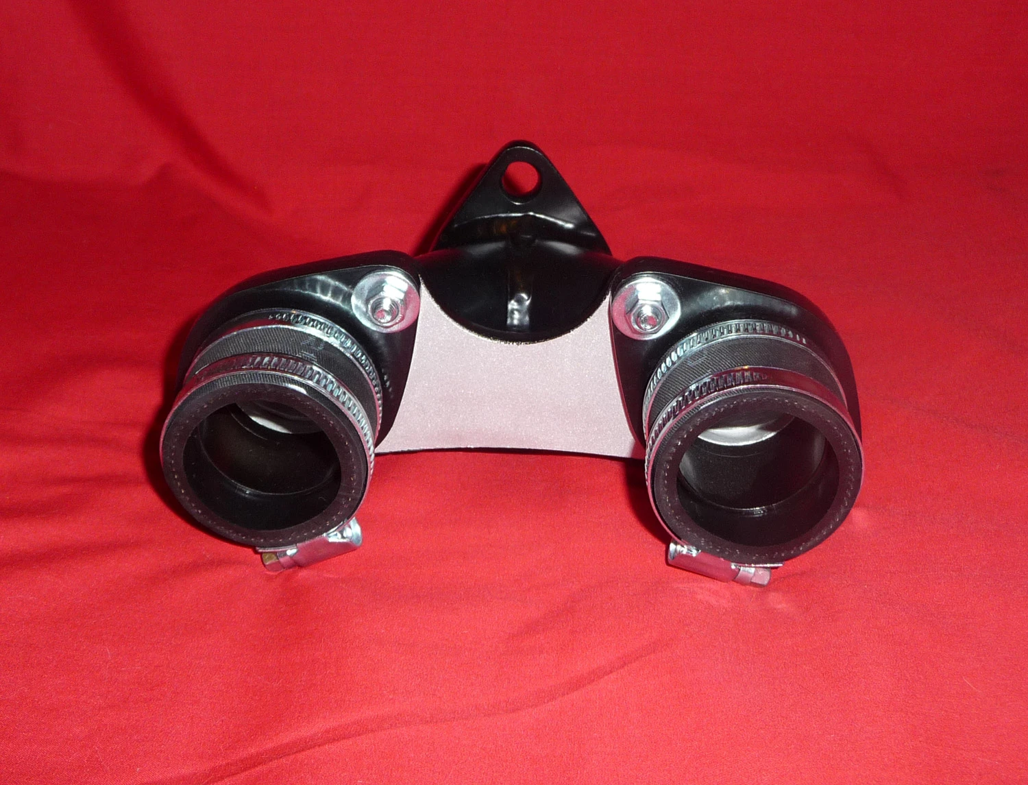 Manifold is made of aluminum, smooth finish. Mounting boots are 40 mm ID. Mikuni VM30-34 carburetors can be installed. Also FCR35, PWK34 carburetors as well. This manifold replaces a S&S super E carburetor to two Mikuni VM30 or similar carburetors. So it can be installed on models that came with S&S set up.