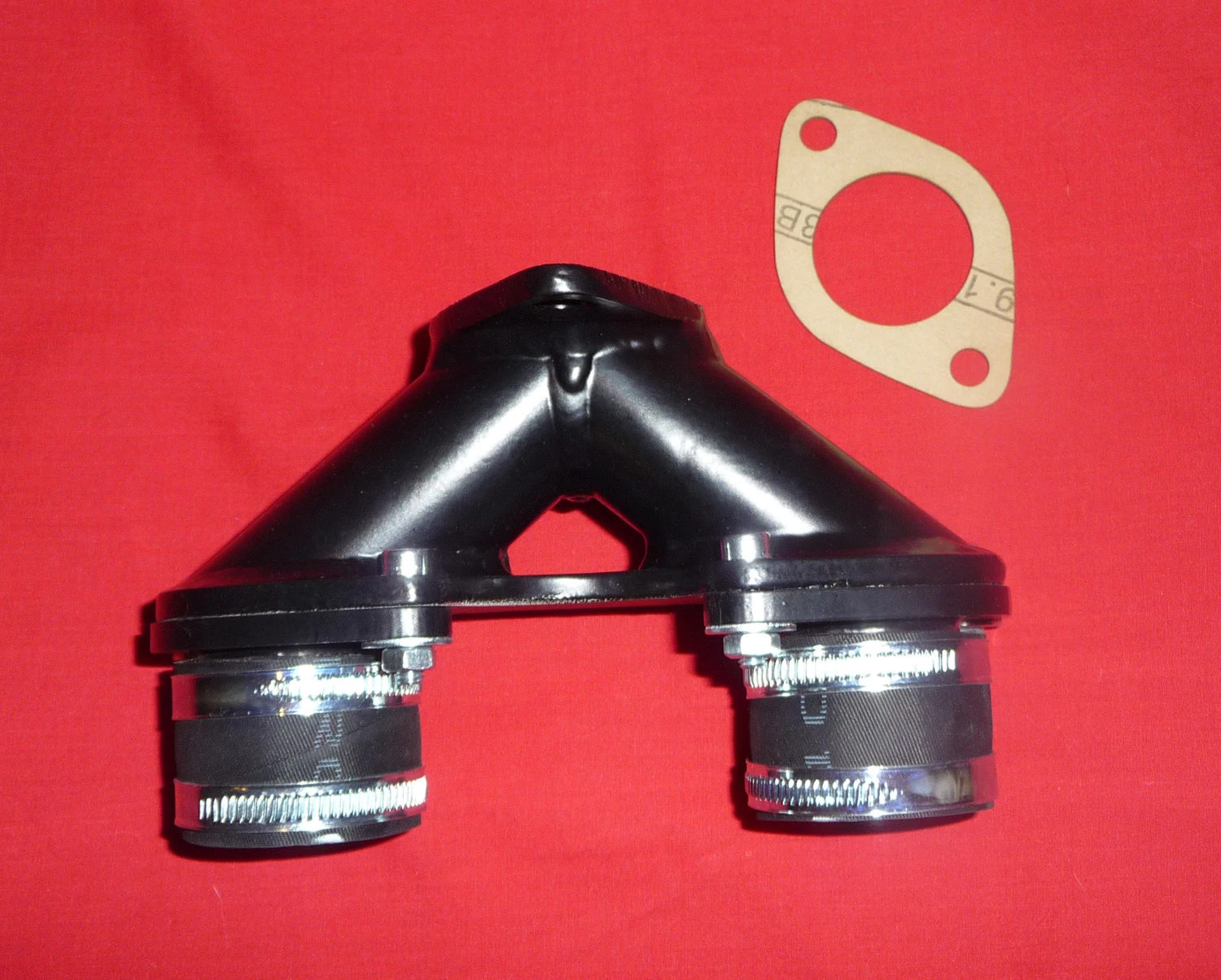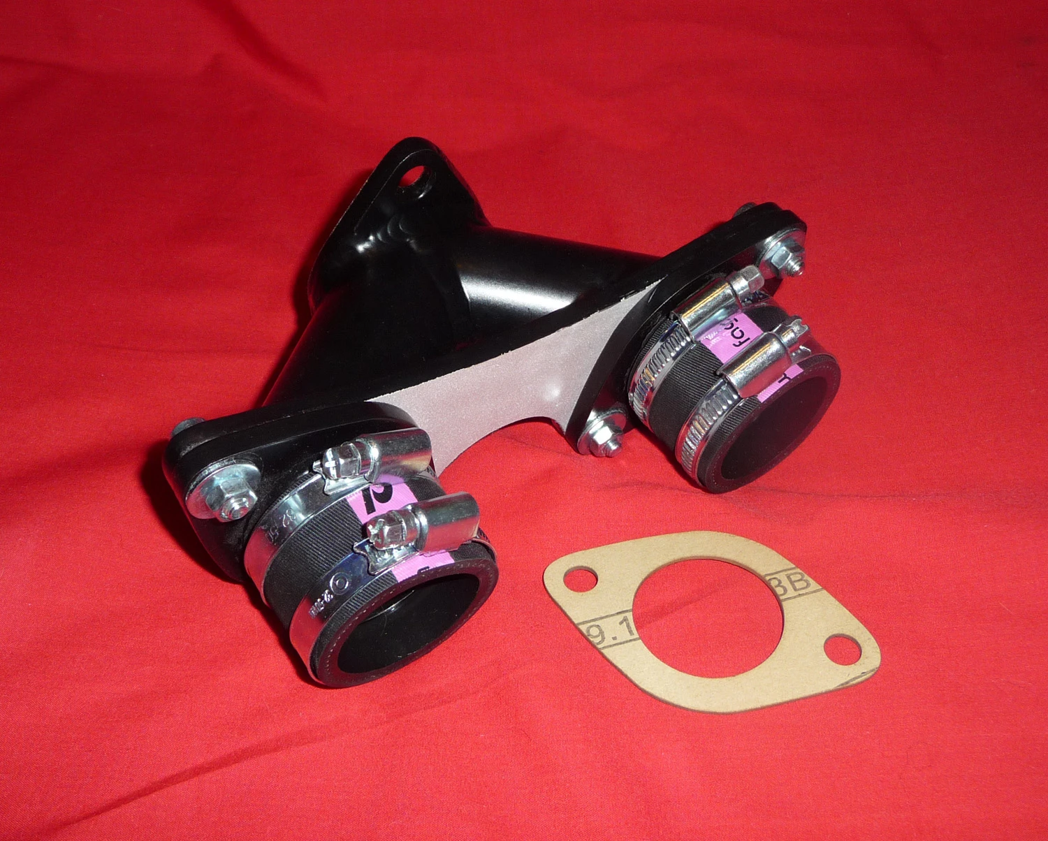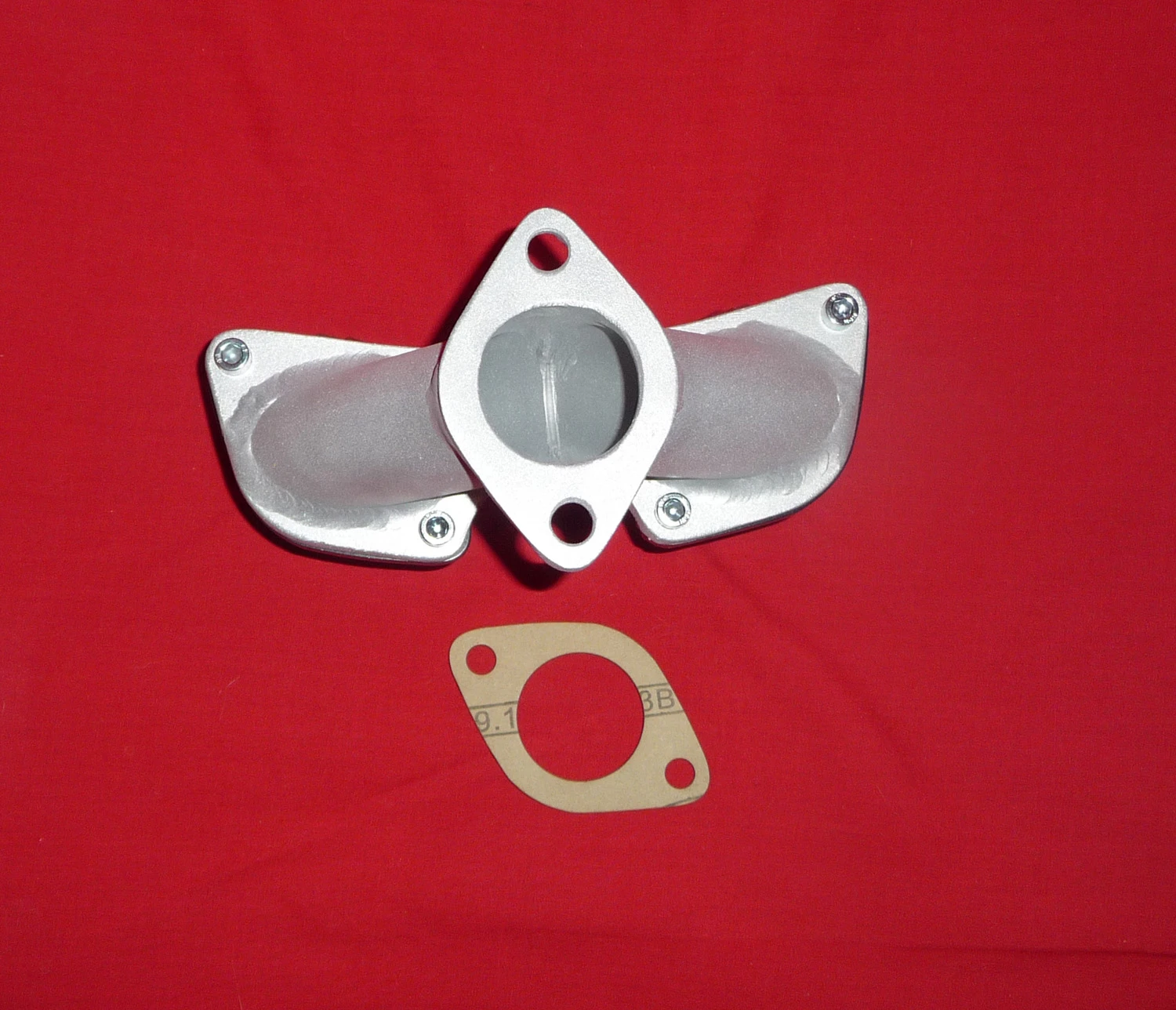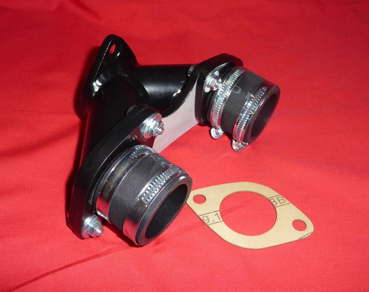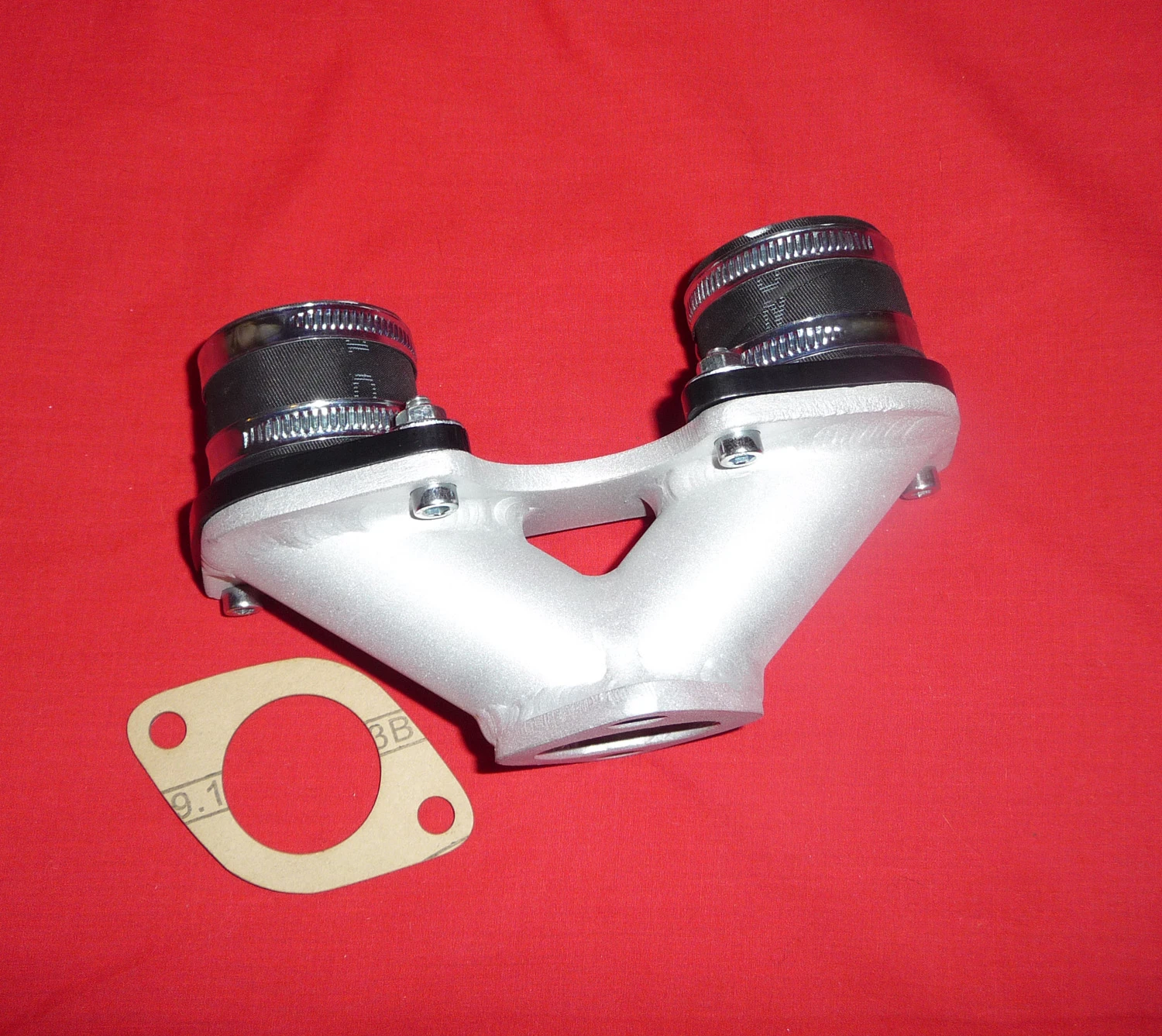 Manifold is made of aluminum, smooth finish. Mounting boots are 40 mm ID. Mikuni VM30-34 carburetors can be installed. Also FCR35, PWK34 carburetors as well. This manifold replaces a S&S super E carburetor to two Mikuni VM30 or similar carburetors. So it can be installed on models that came with S&S set up.
