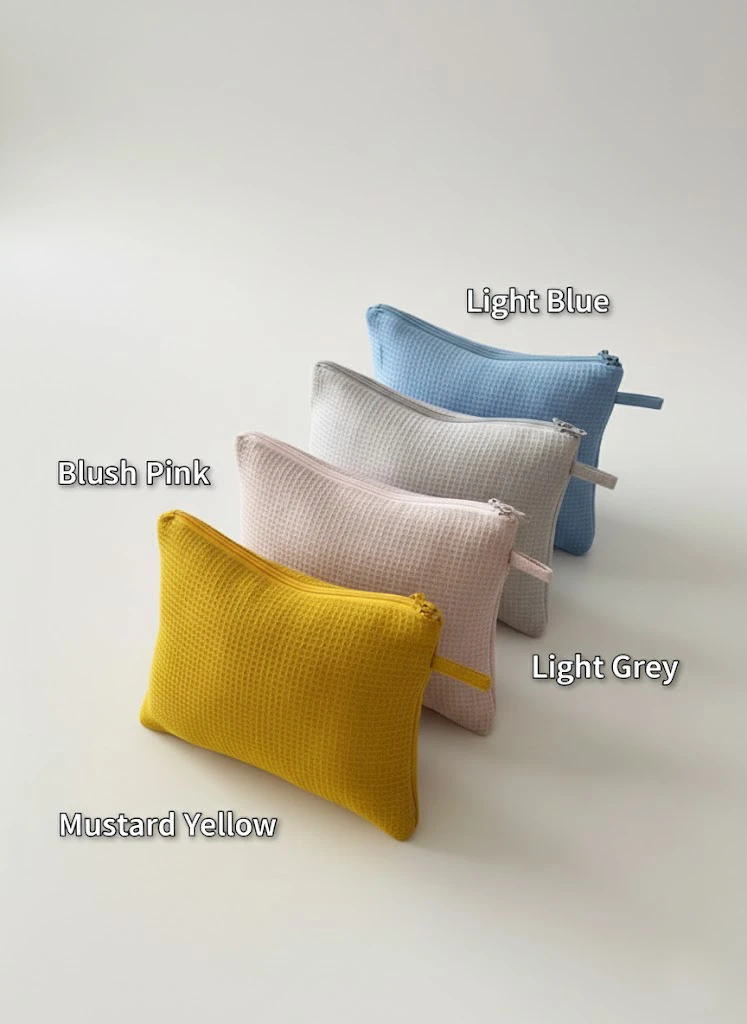 Small waffle wave linen cosmetic bag made from Oeko-Tex certified natural linen. This handmade makeup pouch features a textured small waffle fabric, secure zipper closure, and a lightweight yet durable design.